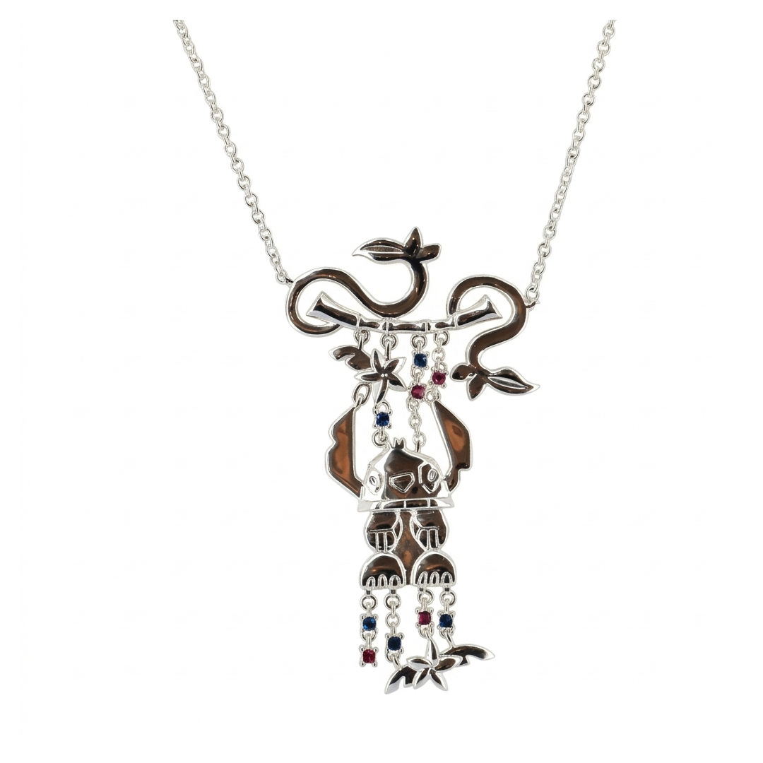 Fall for this unique necklace showcasing silver Stitch in an adorable upside‑down pose, clinging to a stylized branch. The pendant is enhanced with colorful crystals in soft blue and pink tones, bringing sparkle and personality to this chic fashion jewelry piece. The detailed sculpting of Stitch and the branch creates a lively, expressive design, while the silver chain adds elegance and balance to the overall look.
