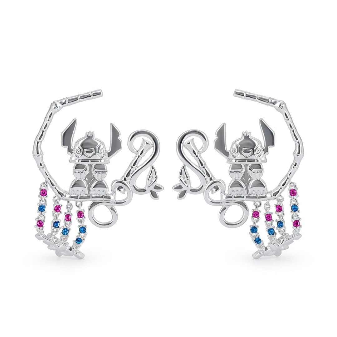 The Stitch Earrings feature Stitch seated inside a refined decorative frame, enhanced with five hanging chains that create a dynamic and trendy look. The detailed design captures the playful and lovable spirit of the character while offering a stylish and harmonious finish. Lightweight and comfortable, they add an original touch to everyday outfits as well as more dressed‑up looks. A perfect choice for anyone who loves fantasy jewelry, unique accessories, and Stitch‑inspired designs.
