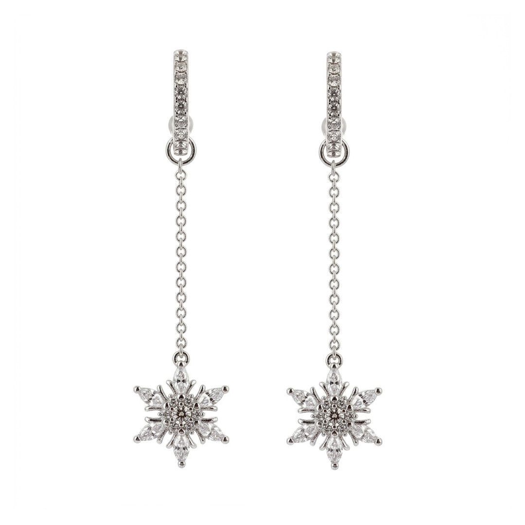 The Snowflake Earrings combine a sparkling hoop with a finely detailed snowflake pendant, creating a bright, elegant and delicate look. Their refined design adds a wintery, sophisticated touch to any outfit. A perfect accessory for anyone who loves feminine, shimmering jewelry.