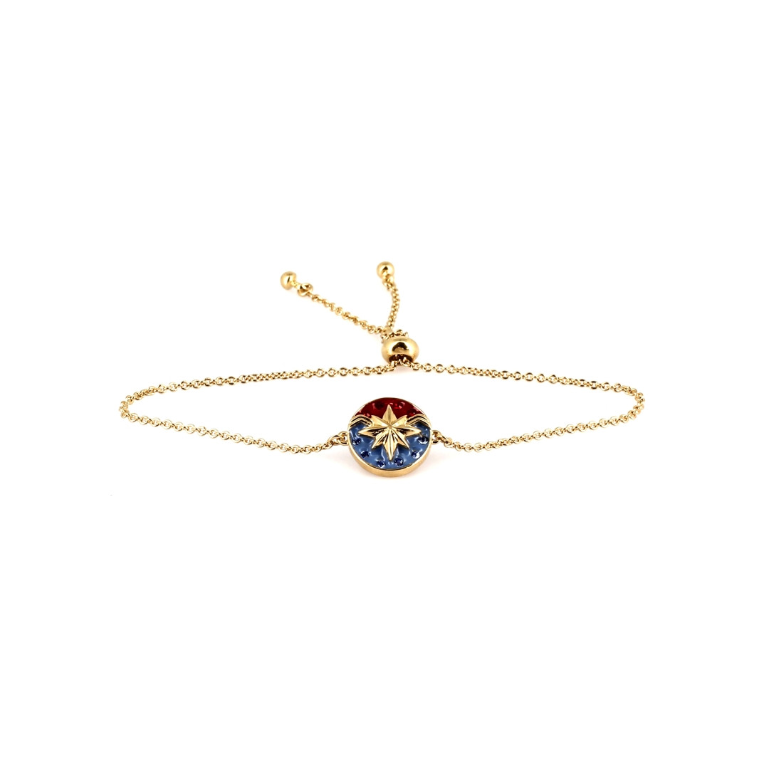This Captain Marvel bracelet highlights Carol Danvers’ iconic star-shaped medallion. With its elegant gold finish and Disney Marvel-inspired design, it represents boldness and hope. Lightweight and refined, wear it alone or stacked for a confidently heroic look. A must-have for Marvel fans and independent spirits.