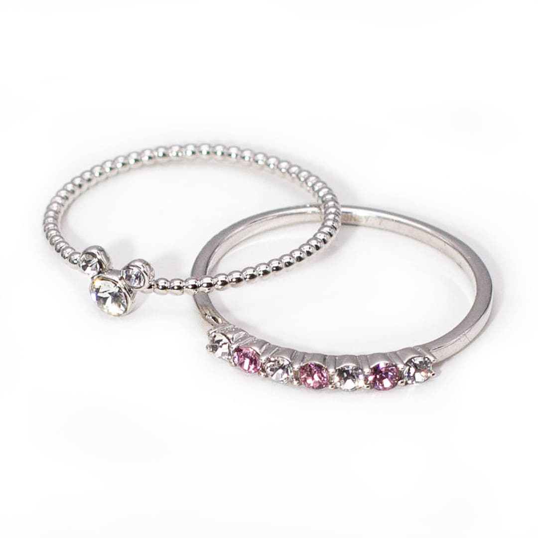 La silhouette reconnaissable de Mickey Mouse est méticuleusement reproduite dans chaque détail de cette bague, avec ses oreilles caractéristiques. Les cristaux blancs et roses, disposés sur la deuxième bague, ajoutent une brillance éclatante et une touche de couleur douce à cette pièce remarquable.