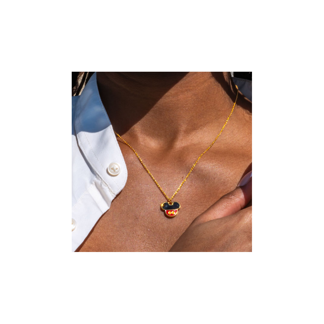 Inspiré du célèbre personnage de Disney, ce collier doré arbore un pendentif représentant la silhouette emblématique de Mickey Mouse, avec ses couleurs classiques : noir, rouge et doré. Son design à la fois ludique et raffiné en fait un accessoire parfait pour tous les amateurs de Disney et les passionnés de mode. Que ce soit pour une touche de magie au quotidien ou pour offrir un cadeau unique, ce bijou apportera une note enchantée et élégante à votre style.