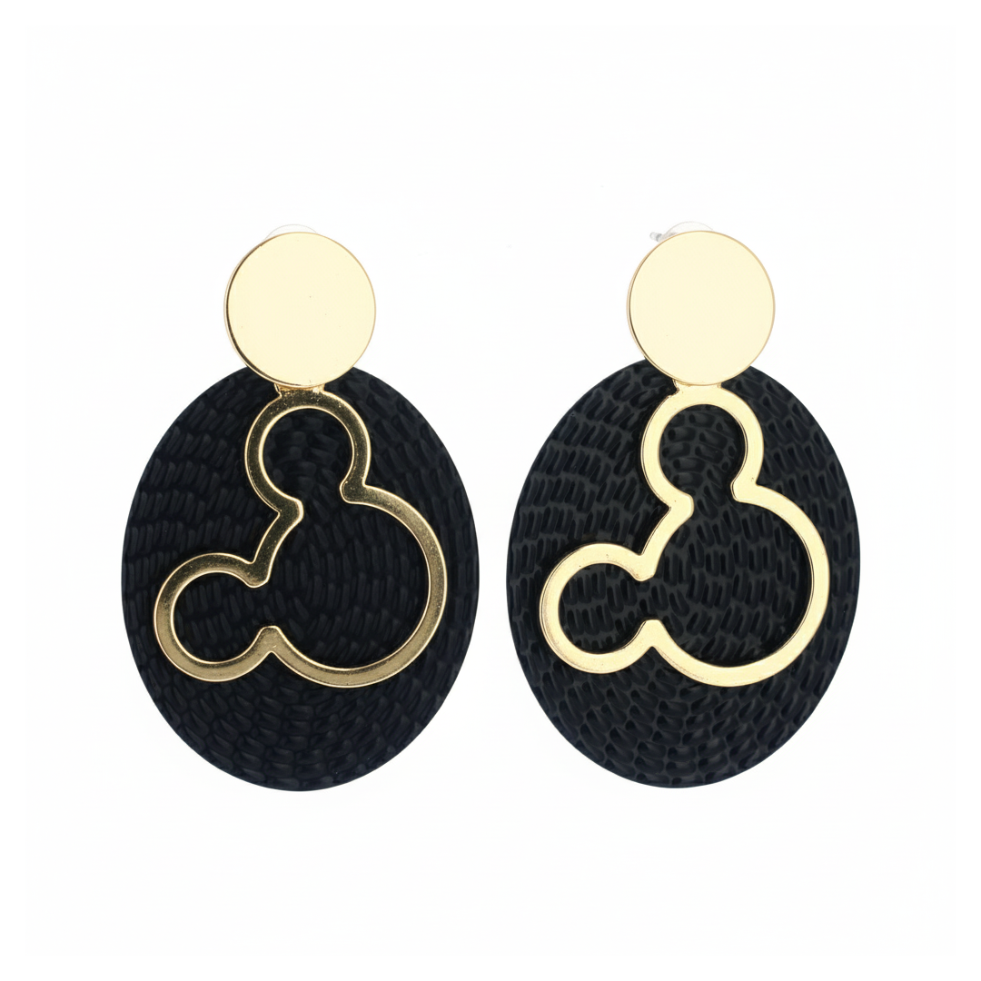 Ces boucles d’oreilles modernes revisitent la silhouette de Mickey avec subtilité et raffinement. En haut, un clou doré circulaire sert de point d’ancrage, relié à une base ovale noire à la texture mate. Un contour doré abstrait s’y dessine, évoquant des formes organiques et des motifs inspirés du mandala.
