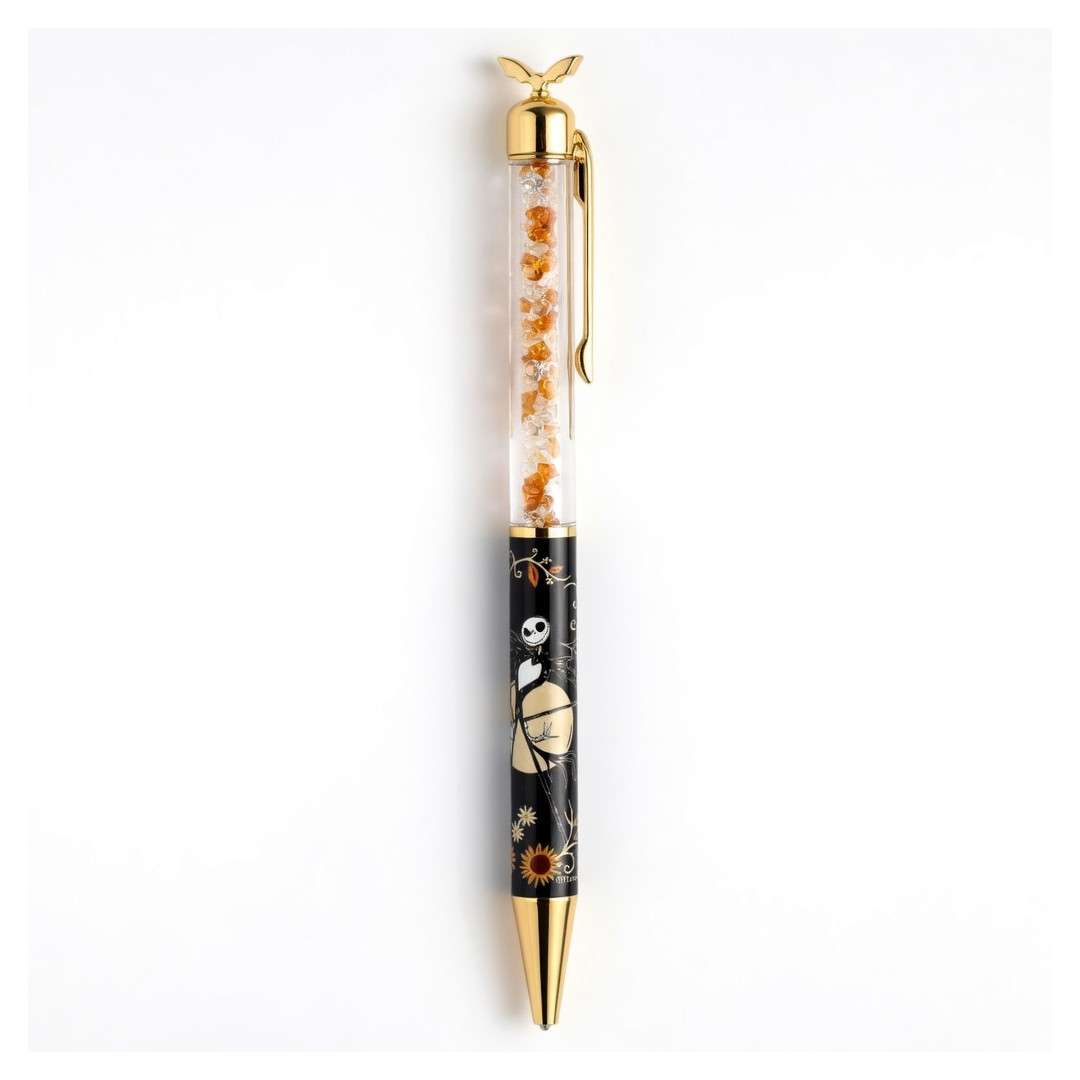 Ce superbe stylo Jack Skellington allie esthétique gothique et élégance moderne. Son corps noir décoré de motifs dorés, d’un Jack iconique et d’une lune lumineuse crée un style unique et artistique. La chambre supérieure remplie de cristaux orange ajoute un effet scintillant à chaque mouvement, tandis que les finitions métalliques dorées, clip, pointe et ornement supérieur, renforcent son allure luxueuse. Parfait comme cadeau original, accessoire de bureau ou pièce de collection, ce stylo offre une écriture fluide et un design qui attire immédiatement le regard.