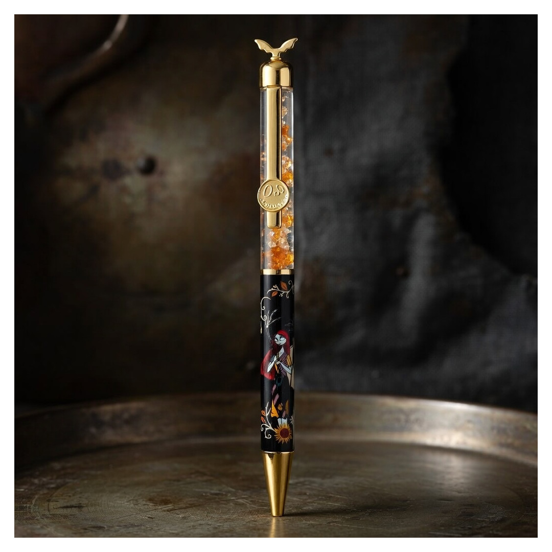 Ce stylo élégant met en avant Jack Skellington dans un design noir orné de motifs dorés, d’une lune stylisée et de détails floraux raffinés. La partie supérieure transparente renferme de cristaux orange scintillants, tandis que les finitions dorées apportent une touche premium. Un accessoire idéal pour les amateurs de papeterie originale et de design artistique.