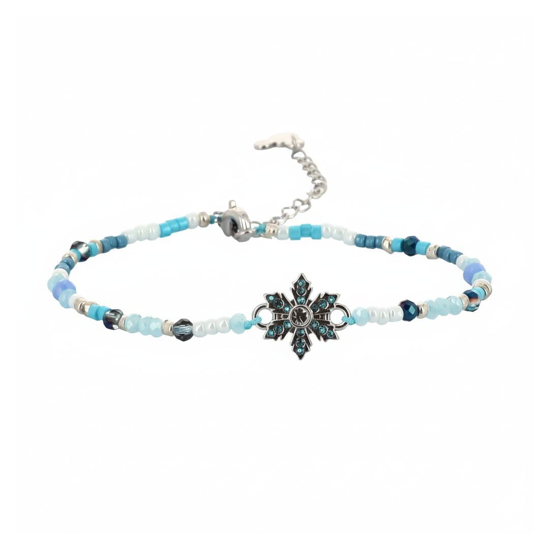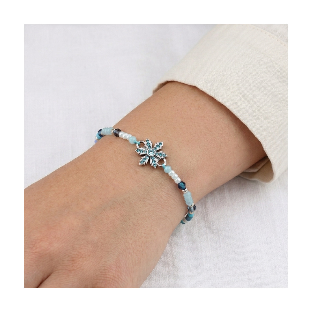 Un bracelet délicat composé de perles bleu glacier, turquoise, blanches et argentées, sublimé par un pendentif flocon serti de pierres bleues. Ajustable, lumineux et élégant, il apporte une touche hivernale, magique et Reine des Neiges à chaque tenue.
